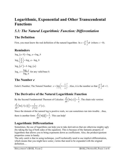 Lnan n ln a 4. Cx and are inverse functions of each other. 3318 Chapter 5 Logarithmic Exponential and Other Transcendental Functions 51 The Natural Logarithmic Function.
